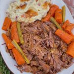 Remove the meat from the pot and shred. Remove the veggies, strain the sauce and serve the roast with the sauce drizzled over top. Enjoy!