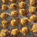 - Using a 2 tbsp cookie scoop or spoon, scoop the filling, pressing slightly against the side of the bowl to lightly compact the mixture, then add to the baking sheet. You can space these pretty closely together as they don’t spread much, but use two baking sheets if needed. These will be quite sticky – you can use your fingers to gently form them, but you don’t want to flatten them too much as the exposed coconut flakes add texture.