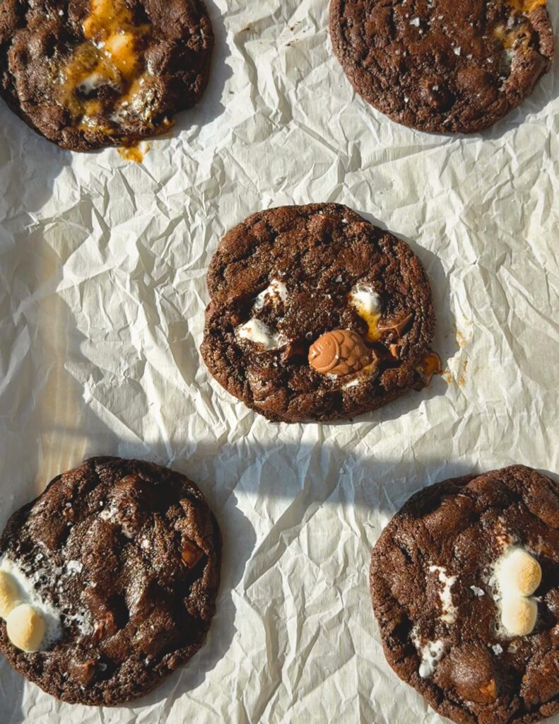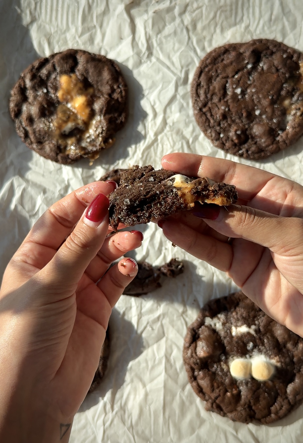 - Placement of the marshmallows and caramel matters. I like to stuff the cookies with the marshmallows and caramel, only having a little bit to peek out. This protects them a bit more from the heat so they don’t get too toasty and melty and end up crunchy. For aesthetics, you can pop on a marshmallow or caramel piece after rolling the cookies, just keep them towards the top so they don’t make contact with the baking pan as they spread.
