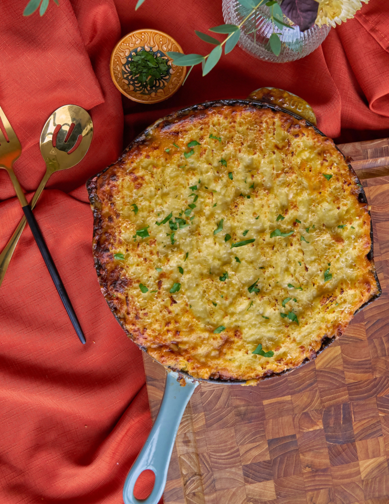 *You can use a 9”, 10”, or 12” cast iron, just keep in mind this will be quite full in a 9” cast iron. If you don’t have a cast iron or ovenproof skillet, just cook this in a skillet and transfer to a 9×9” baking dish before adding the mashed potatoes and baking.