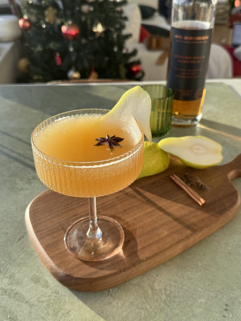 The star of the show here is St. George Spiced Pear Liqueur, a newer addition to my bar cart that has quickly earned permanent status. It’s warming, gently spiced, and incredibly versatile — the kind of bottle that makes you want to add it to everything (a pear margarita might be next 👀). Paired with prosecco and a splash of soda, it turns into a bright, bubbly cocktail that absolutely deserves a spot at your holiday gatherings.