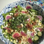 It’s everything I want in a spring dish: fresh, vibrant, and packed with seasonal veggies and mosty importantly: flavor. You’ve got peppery arugula, crisp veggies, soft herbs, creamy cheese, and crunchy pistachios, so every bite has a little bit of everything. The real star that brings the whole thing together though is the caramelized shallot vinaigrette—slightly sweet, tangy, and rich, it perfectly balances all the bright, green flavors in the salad.