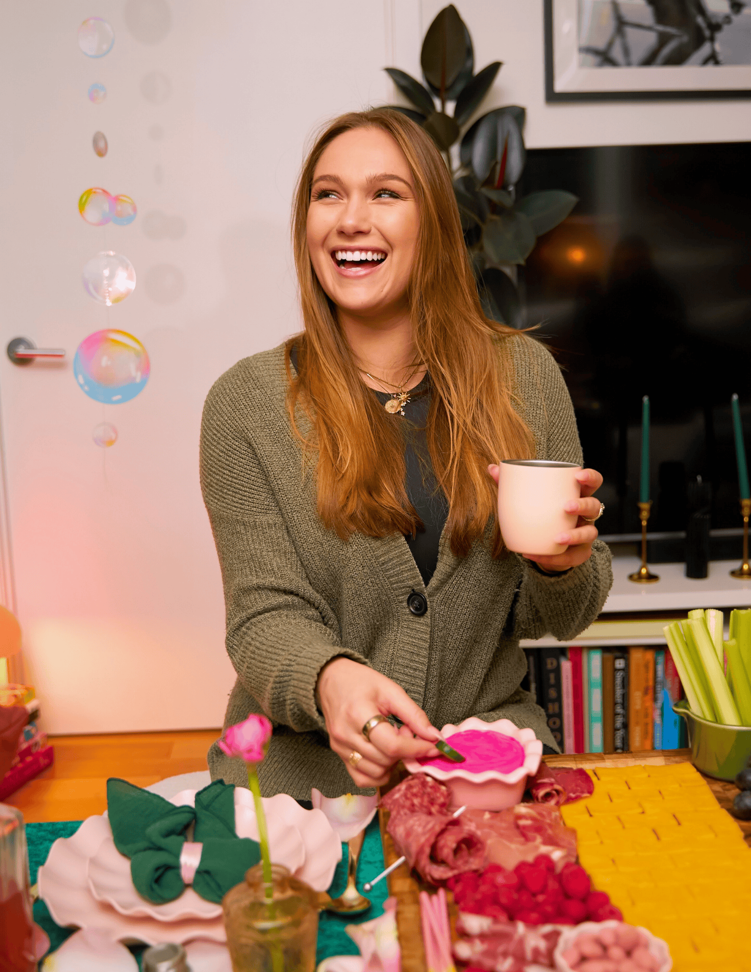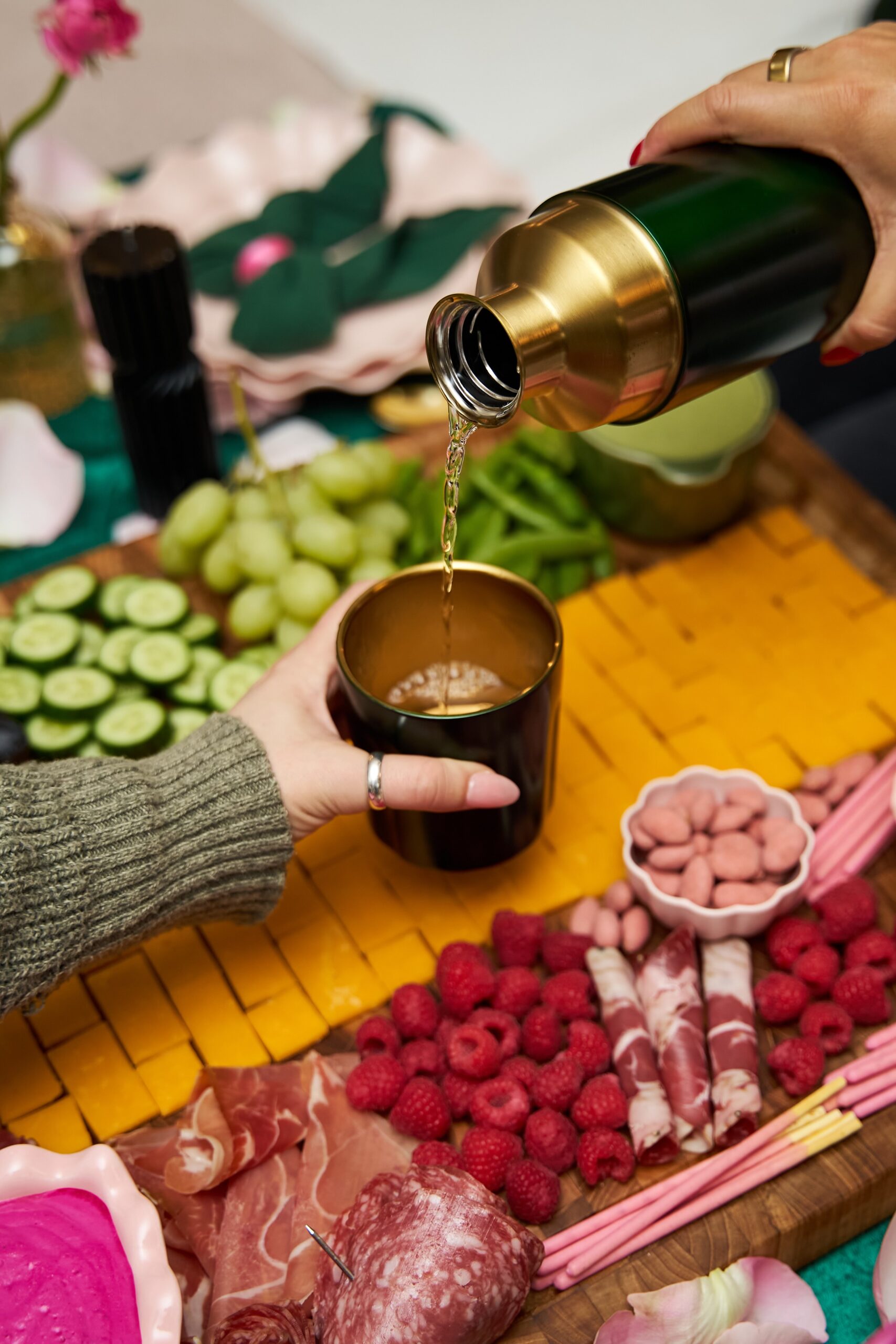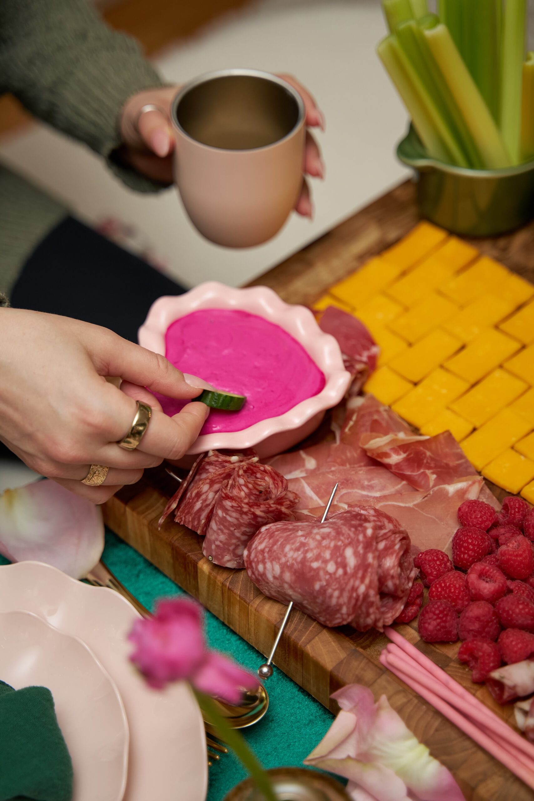 My inspo for the menu was purely color based – thinking about what foods are naturally green and pink, and filtering down from there. I also wanted to actually hang with my girls, so each recipe was designed to be make-ahead friendly, which made hosting so much more enjoyable. Going for more of an apps + dessert menu vs massive menu also allowed me to be more present in the festivities. Here’s what I served: