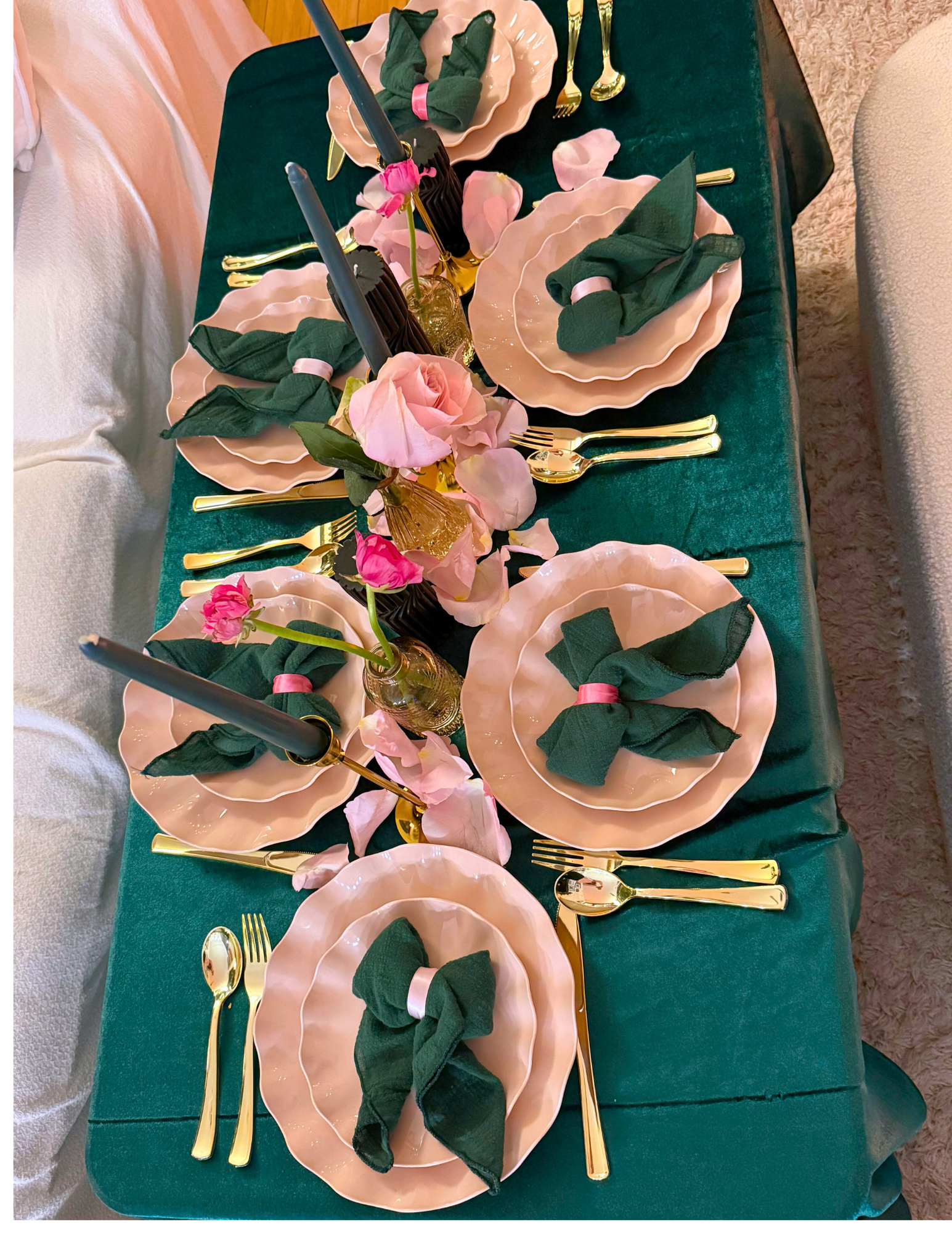 - Emerald green tablecloths & light pink runners