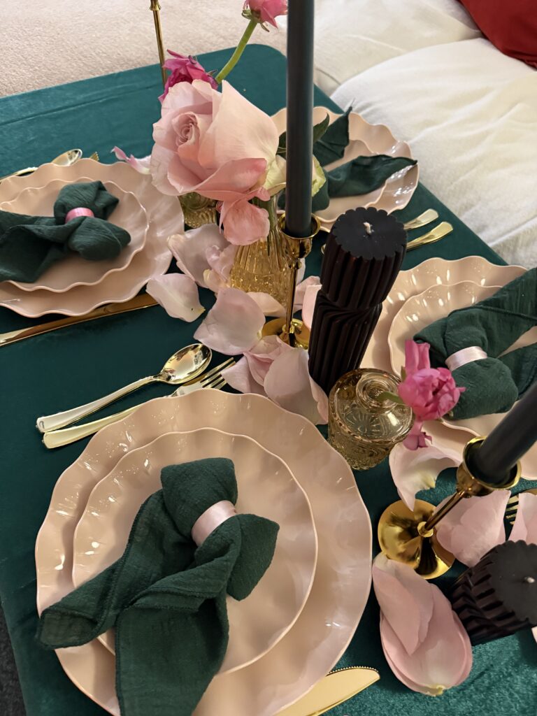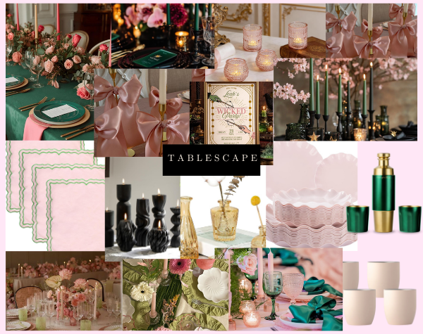 The heart of this party was the Wicked theme—emerald greens paired with soft pinks—playing off the idea of good witch vs. wicked witch. I wanted it to feel both somehow bright and girly yet moody, so I leaned into soft pink florals contrasted with dark emerald green tablecloths and black candles.