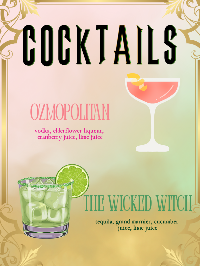 A Wicked-inspired twist on a classic cosmopolitan, this cocktail brought the pink side of the theme to life. It was light, slightly tart, and an instant crowd-pleaser. I used Ina Garten’s signature recipe, with a slight tweak due to personal preference.