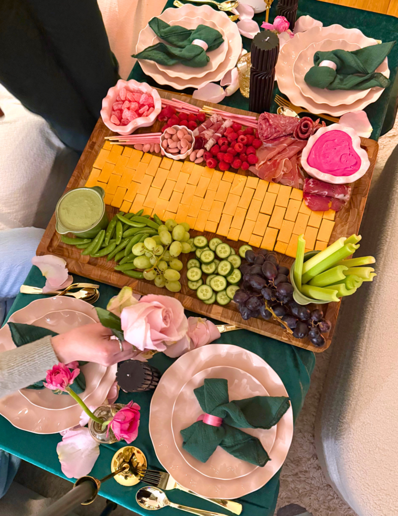 This year, I really wanted to lean into that. An intentional night centered around friendship, fun, and went beyond just a regular Galentine’s theme. And what better way to do that than with a Wicked-themed Galentine’s party?! Inspired by the iconic green and pink color palette and brought to life through themed cocktails, festive food (including a yellow brick road charcuterie board hello?!), whimsical decor, and a vibe that felt equal parts cozy and celebratory.