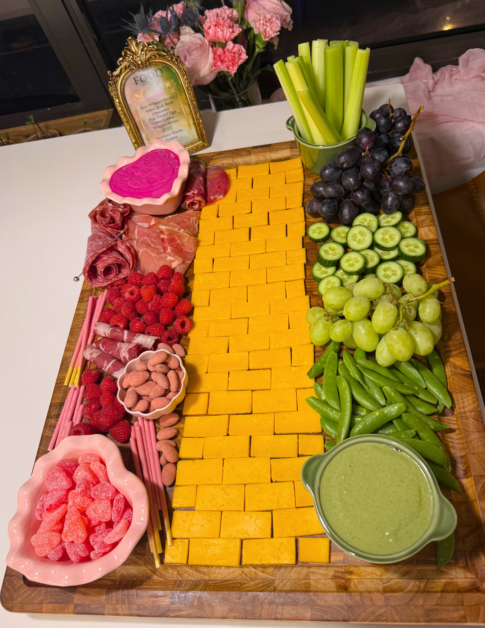 If there was one true showstopper of the night, it was the Yellow Brick Road charcuterie board. It acted as a centerpiece for the table and really tied the whole theme together. I used cut cheddar cheese for the “yellow brick road” in the middle, and then chose pink and green food items to line each side. This was honestly such a great low effort, high reward dish as it kept us fed throughout the night without actually having to cook anything.